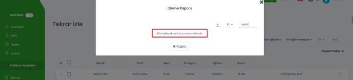 - Admin – Tekrar İzle – İzleme raporu sayfasında listede veri yoksa mesaj verildi.