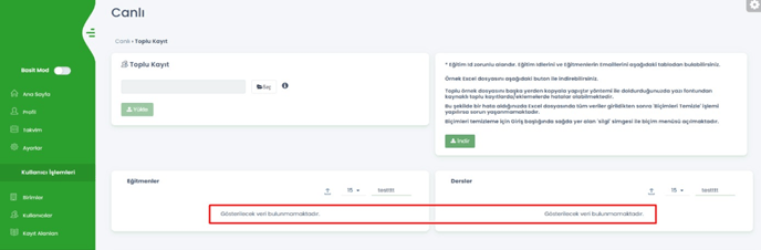 - Canlı – Toplu Kayıt sayfasında listede veri yoksa veri yoktur mesajı eklendi.