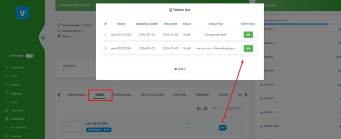 - Kullanıcı – Eğitimler – Canlı sayfasında, izle butonuna basıldığında pop-up olarak tekrar izlenin gösterilmesi sağlandı.