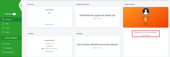 - Admin – Liderlik tablosunda listede veri yoksa veri yoktur mesajı verildi.