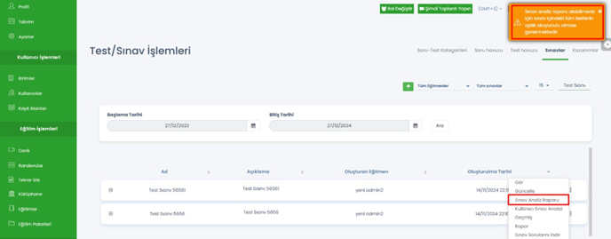 - Admin – Sınavlar – Sınav analiz raporuna uyarı mesajı eklendi.