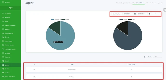 Bu sayfadan kullanıcı cihaz ve tarayıcı bilgisine ulaşılabilecek. Tarihe göre filtreleme yapılabilecek.