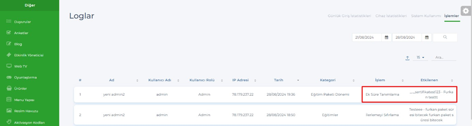 Admin – Eğitim Paketleri – Ek süre tanımla alanında bir kullanıcıya ek süre tanımlandığında loglar da gösterimi sağlandı.