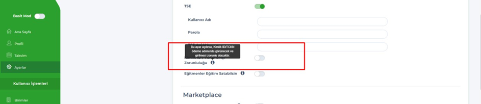 - Admin – Ayarlar – Ödeme & Marketplace – Kimlik ID / TC girişi zorunluluğu ayarında bulunan info değiştirildi.