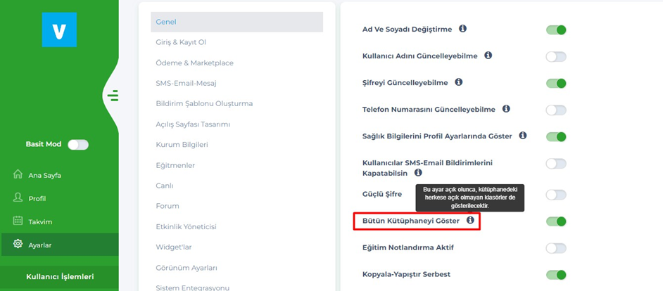 - Admin – Ayarlar – Genel – Bütün kütüphaneyi göster ayarına info eklendi