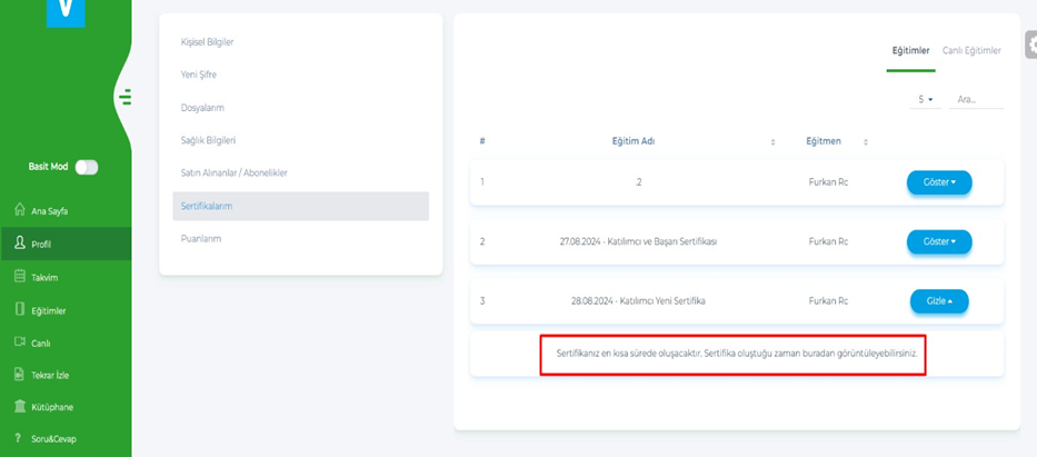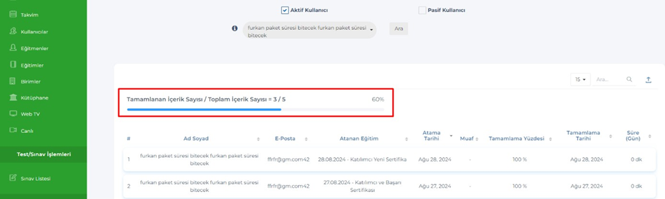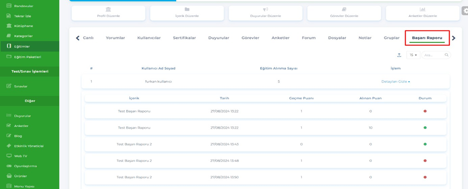 Bu işlemlerin raporu, Eğitimler – Başarı Raporu tabı altında listelenecek.