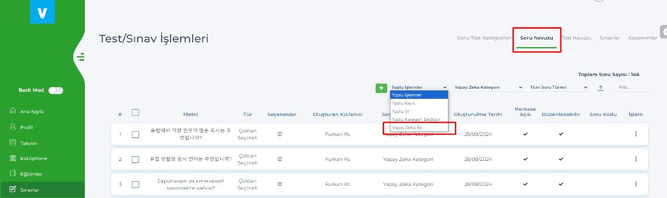 - Admin & Eğitmen – Sınavlar – Soru Havuzu – Toplu İşlemler alanına, Yapay Zeka ile soru ekleme özelliği getirildi.