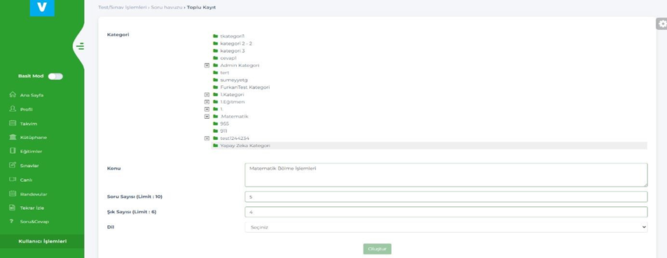 Açılan sayfadan soru/test kategorisi, konu, soru sayısı, şık sayısı ve dil seçilerek soru oluşturulabilecek. ( Şuan için çoktan seçmeli tipinde sorular oluşturuluyor. )