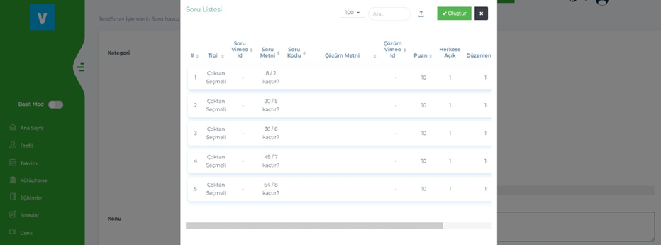 Oluştur dediğimizde oluşturulan soruların görüleceği pop-up gelecek. Burada sorular istenilen gibiyse oluştur denilerek sorular oluşturulacak.