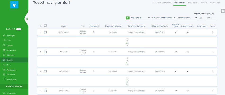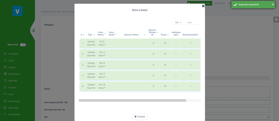 Soru havuzu sayfasından oluşturulmuş sorulara ulaşabiliriz.