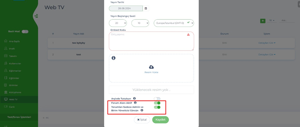 - Birim Yöneticisi – Web Tv – Ekle sayfasına, Admin tarafında bulunan Forum alanı ve Yorum görünümü ayarları eklendi.
