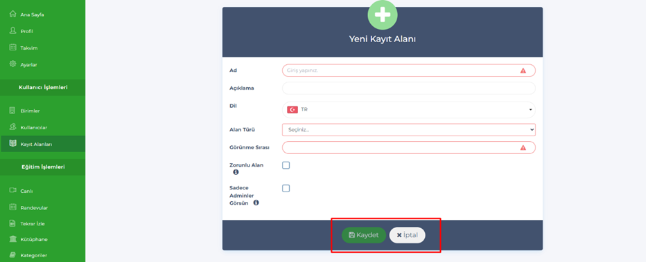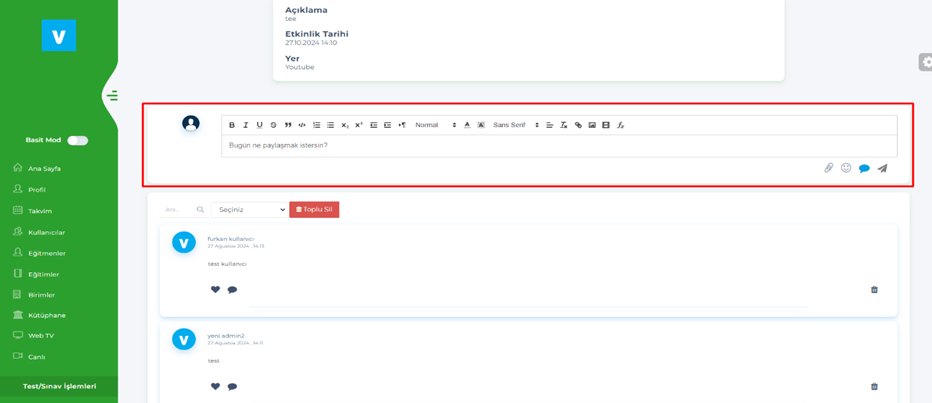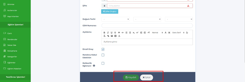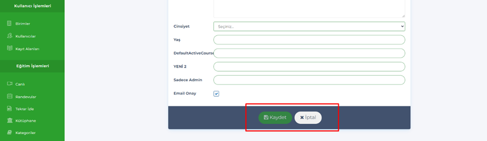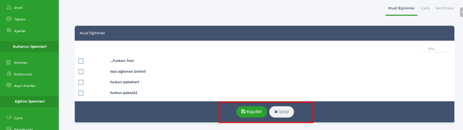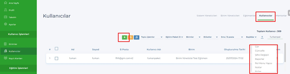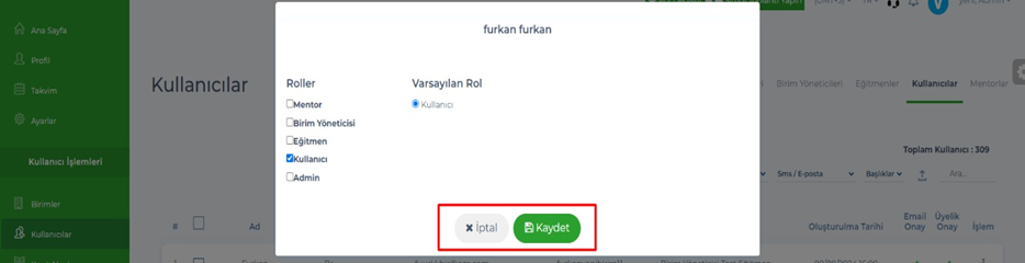 - Admin – Kullanıcılar – Eğitmenler,Birim Yöneticileri, Adminler, Mentorlar