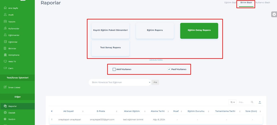 - Birim Yöneticisi – Raporlar – Birim Bazlı raporunda bulunan tablara, Aktif / Pasif kullanıcı filtreleri eklendi.