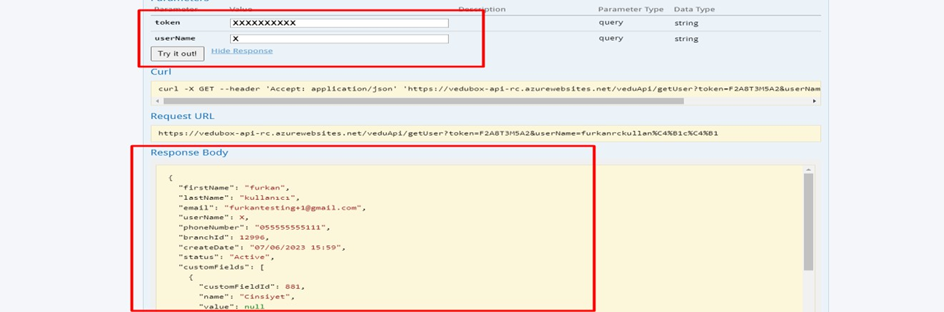 Kullanıcı adı ve token yazılarak kullanıcı bilgisi alınabilecek.