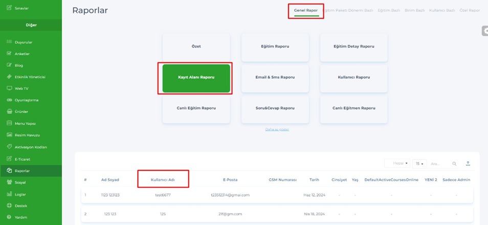 - Admin – Raporlar – Genel Rapor – Kayıt Alanı Raporuna, Kullanıcı Adı sütunu