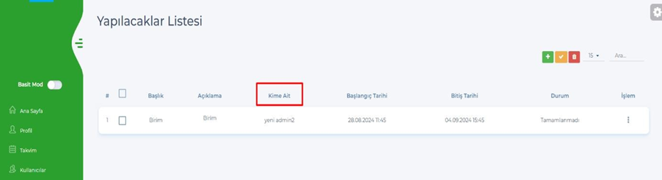 - Birim Yöneticisi – Yapılacaklar Listesi – Hepsini Göster sayfasına Kime ait sütunu eklendi.