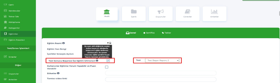 - Admin & Eğitmen – Eğitimler – Profil – İçerikler sırasıyla açılsın ayarı altına, “ Test sonucu başarısız ise eğitim sıfırlansın “ ayarı eklendi.