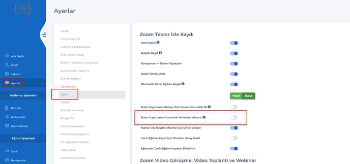 3 - Admin - Ayarlar – Canlı sayfasına, Bulut kayıtlarını otomatik Vimeo’ya aktar ve Kayıtlar