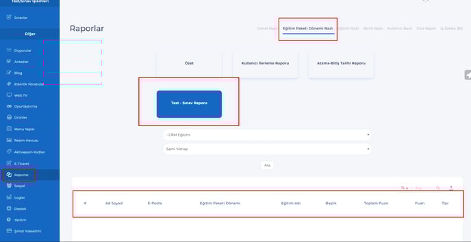 5- Raporlar – Eğitim paketi dönemi bazlı sayfasına, Test – Sınav raporu eklendi.