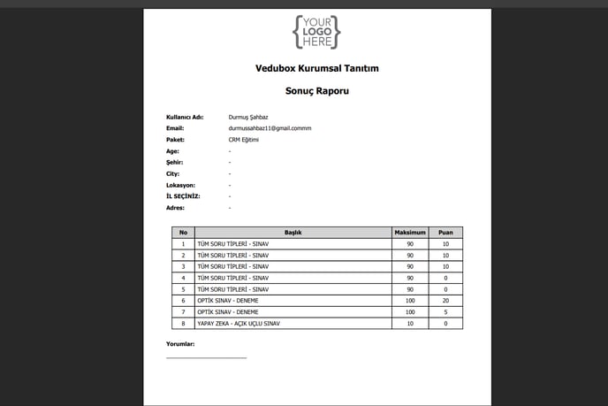 Rapor kurum logosu, PDF olarak çıktı alınabilir.