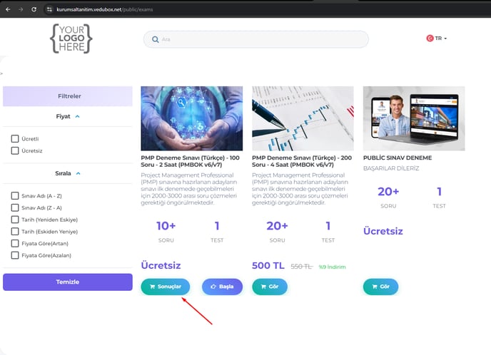 Kullanıcı sınavı tamamladıktan sonra sonuçlar sayfasından sonucunu görebilecek.
