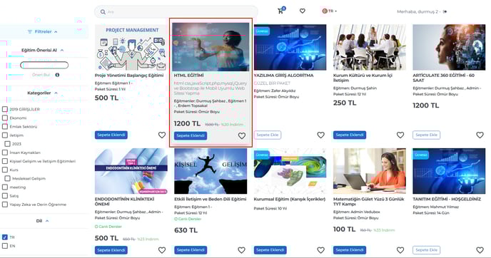 10 - Marketplace sayfasında bir eğitim üzerine gelindiğinde çerçeve şeklinde