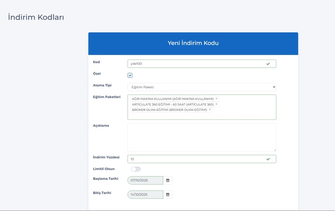 11 - İndirim kodları sayfasına, birden fazla eğitim paketi ekleme özelliği eklendi.