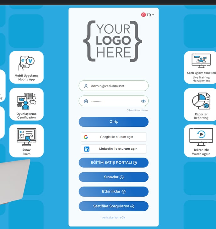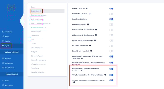 13- Giriş & Kayıt ol sayfasına, Giriş sayfasında sınavlar, etkinlikler butonunu göster