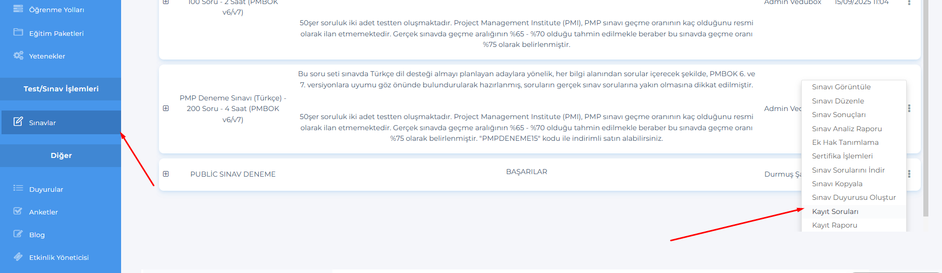 2- Sınavlar – Satışa sunulan sınavlara, Kayıt raporu ve soru özellikleri eklendi.