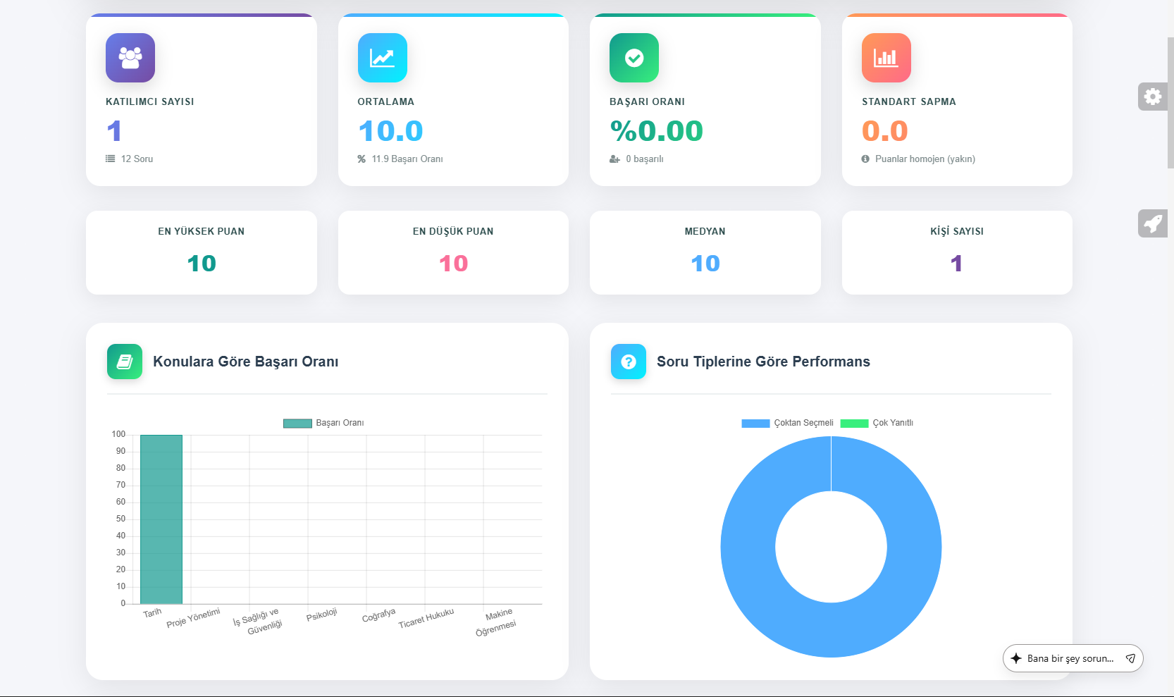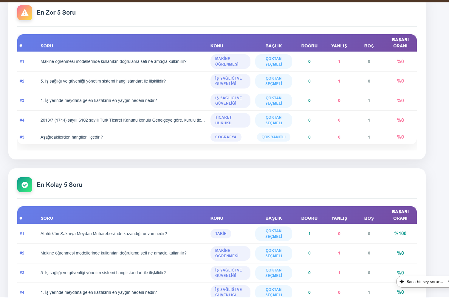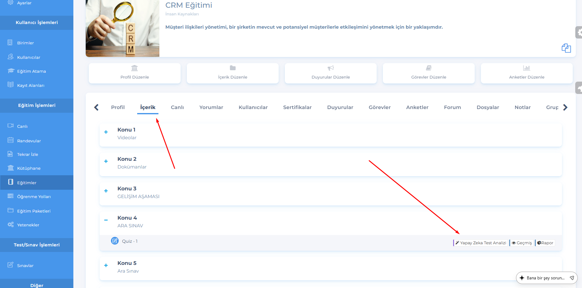 6- Eğitimler – Alınan test içeriklerinde, Yapay zeka test analizi özelliği eklendi.