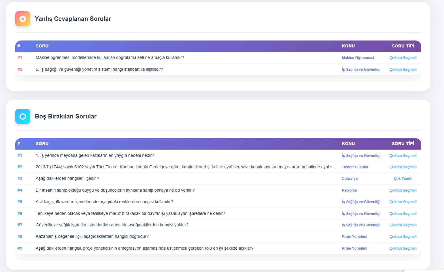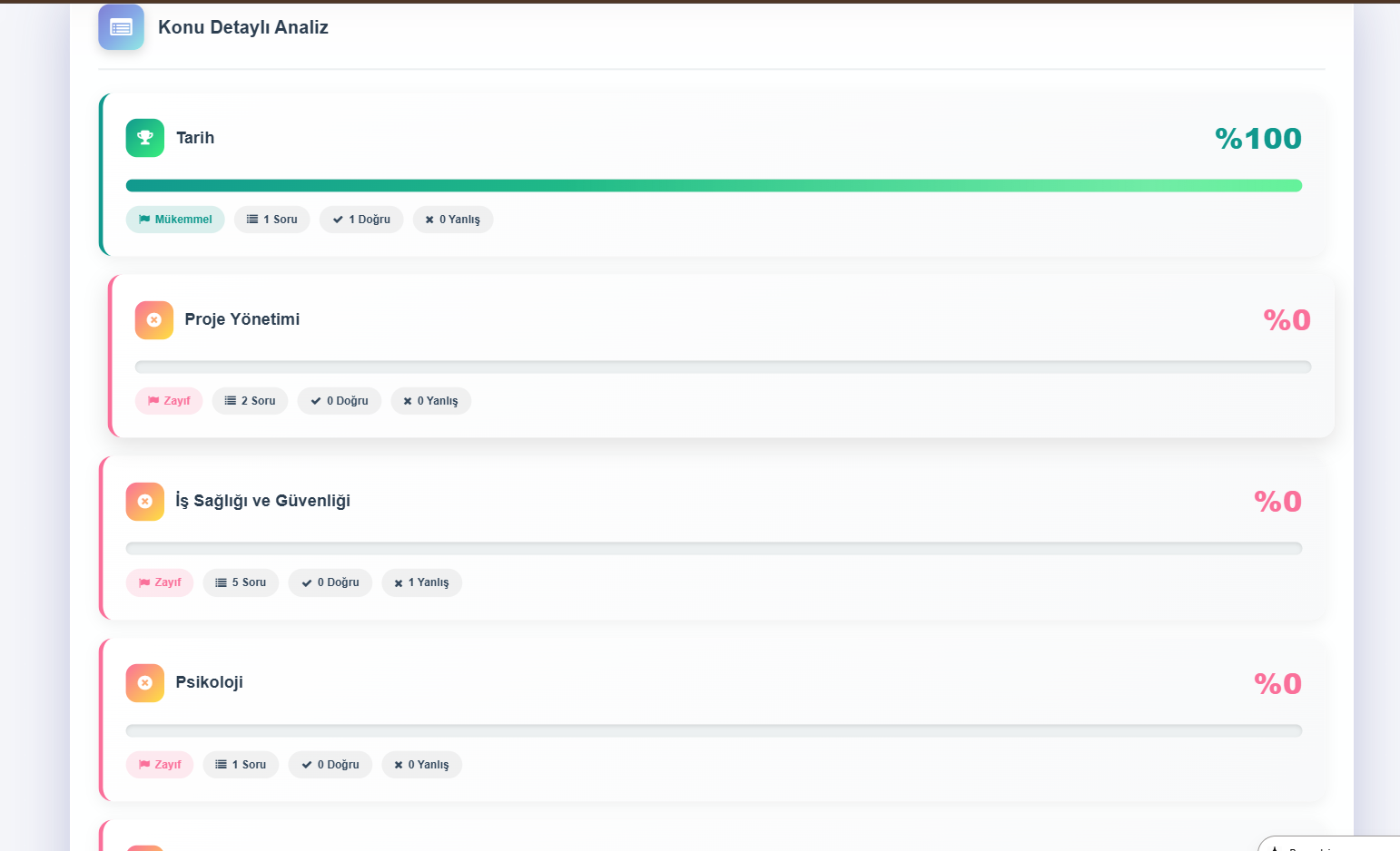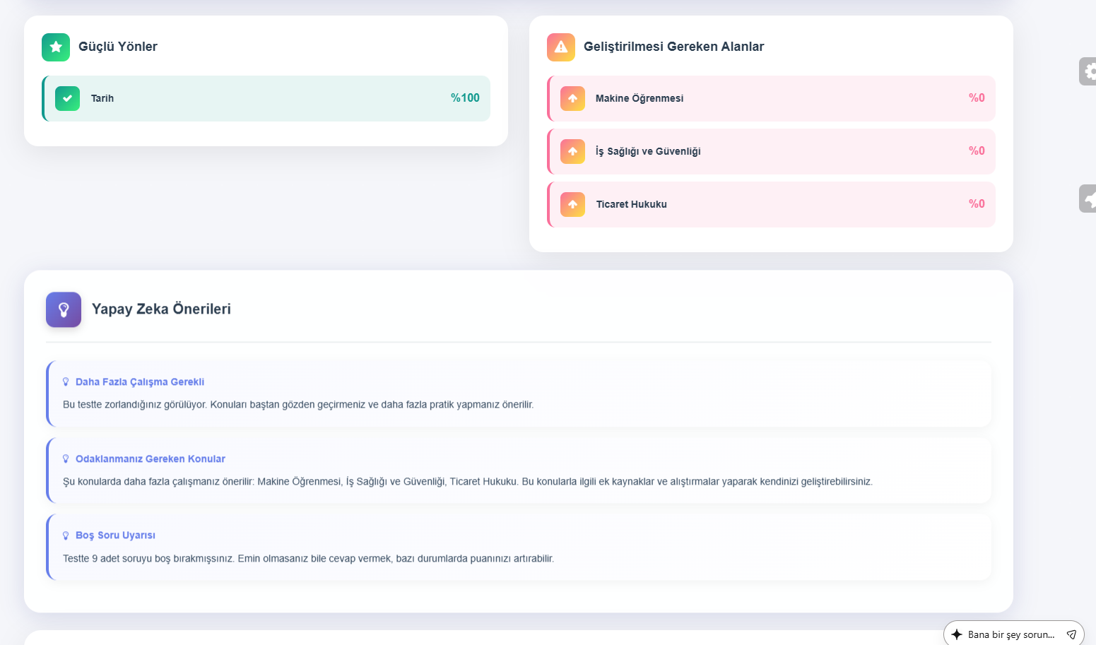 Kullanıcı tarafından alınan test içeriklerinin analizi yapay zeka ile yapılabilecek.