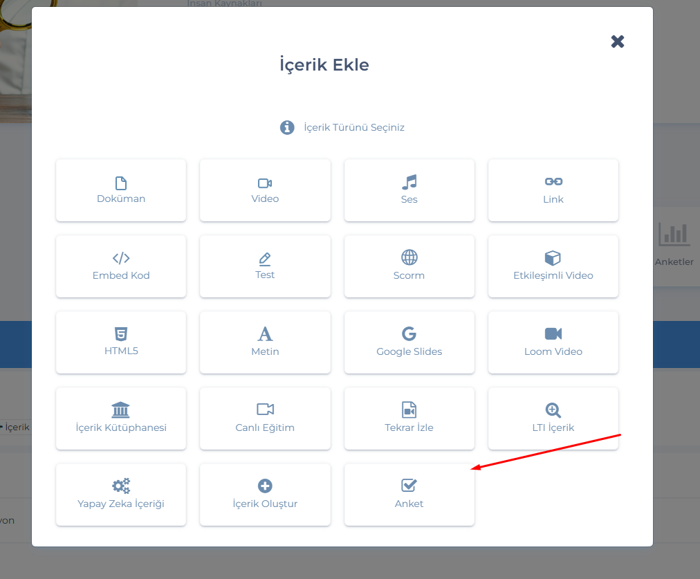 10- Eğitimler – İçerik ekle sayfasına, Anket tipi eklendi.
