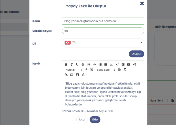1- Etkinlikler – Ekle sayfasına, yapay zeka ile etkinlik açıklaması oluşturma özelliği
