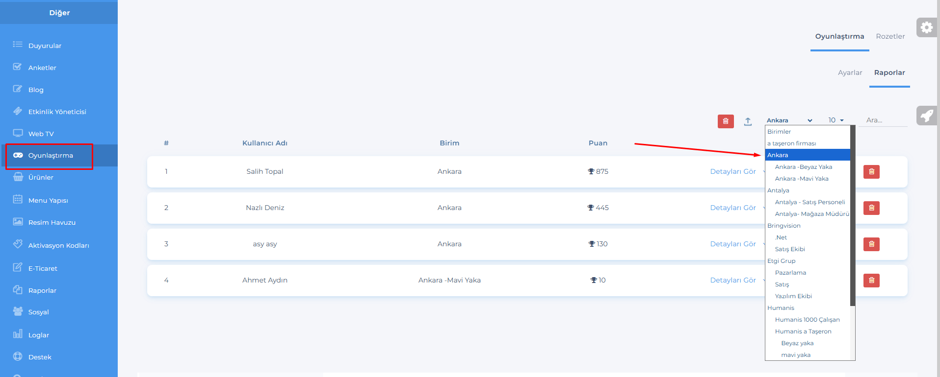 6 - Oyunlaştırma – Raporlar sayfasında, Üst birim seçildiğinde alt birimlere ait