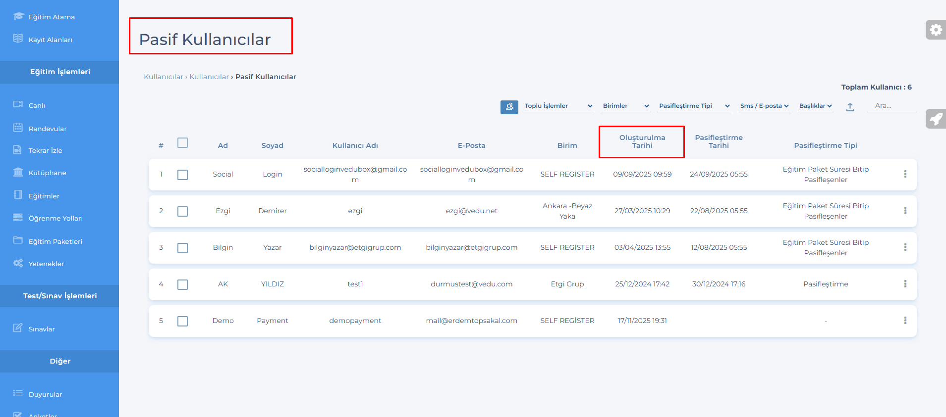 7- Kullanıcılar – Pasif kullanıcılar sayfasına, oluşturma tarihi bilgisi sütun olarak