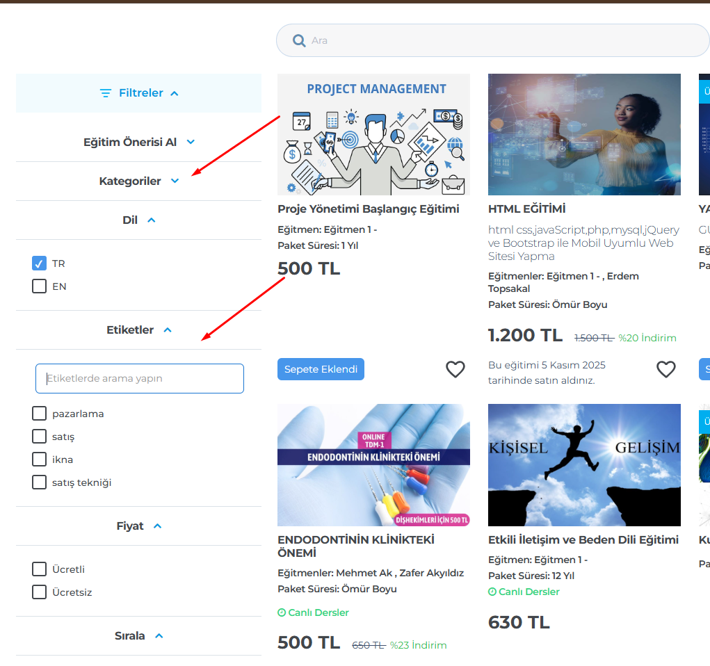 4- Marketplace sayfasında daha önce 12 eğitim olacak şekilde yapılan listelemede