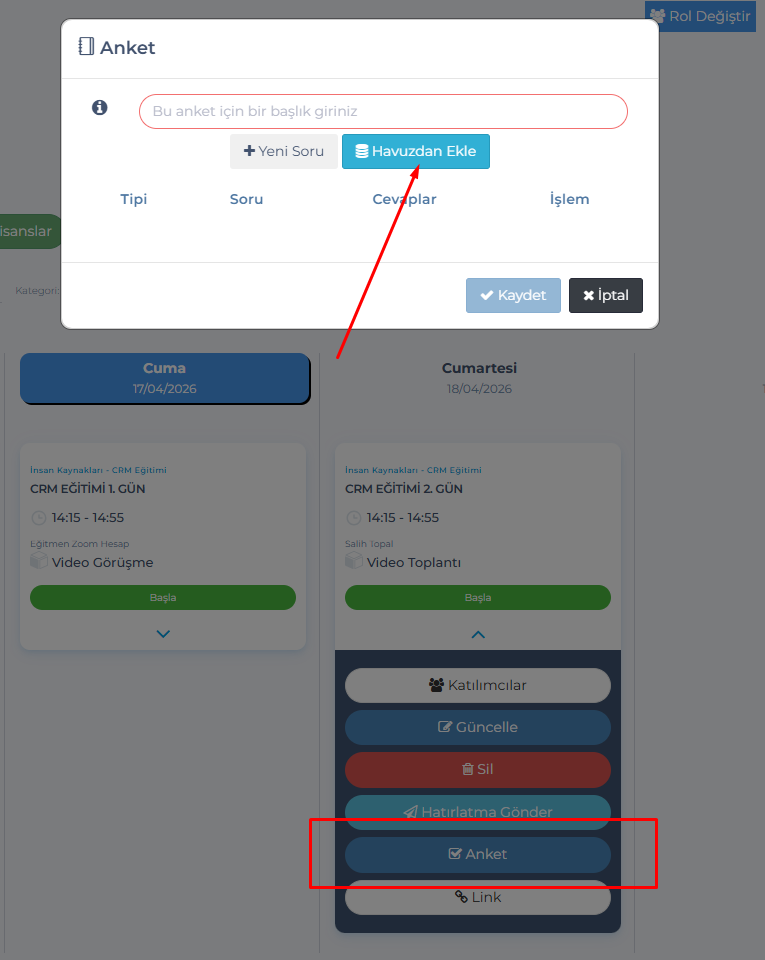 Bu ayar ile oluşturulan sorular, canlı sayfasında bulunan havuzdan ekle butonu ile