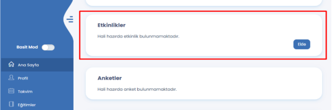 12- Etkinlikler özelliği ile ilgili widget ve sistem işleyişi sistemden kaldırıldı.