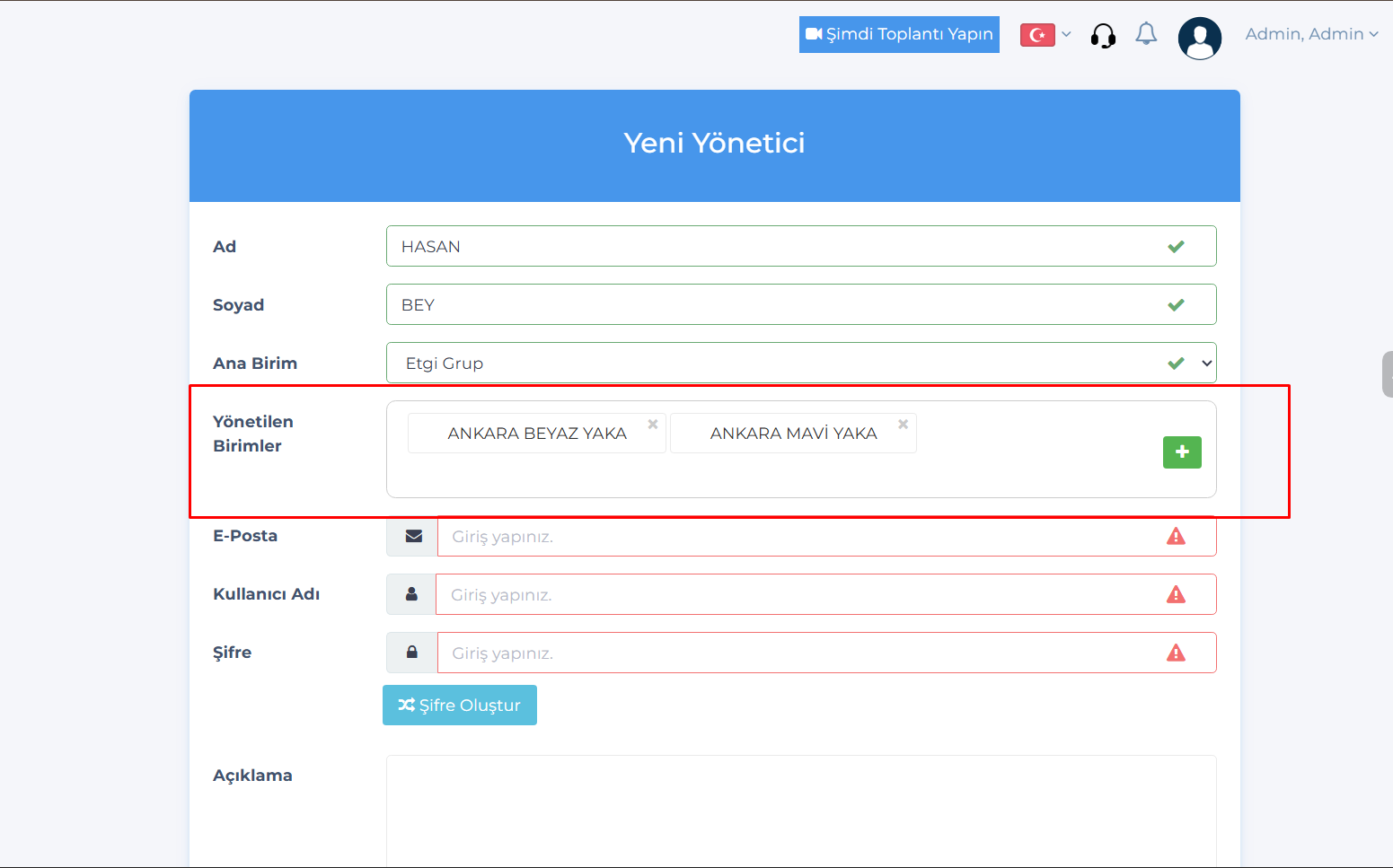 2- Admin – Kullanıcılar – Birim Yöneticisi – Ekle & Güncelle sayfasına