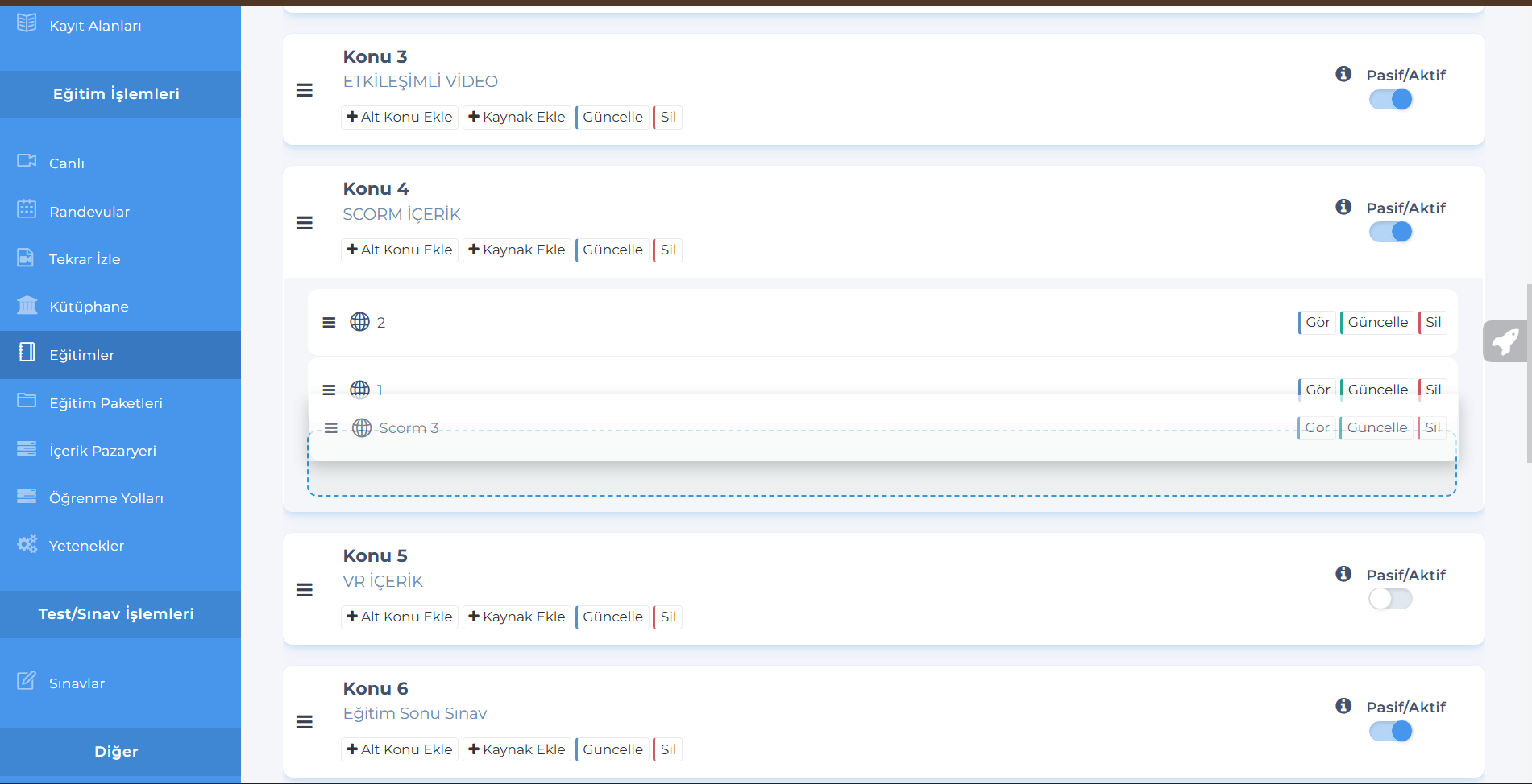 5- Eğitim konu ve içeriklerini sürükle bırak yöntemiyle sıralama özelliği getirildi.