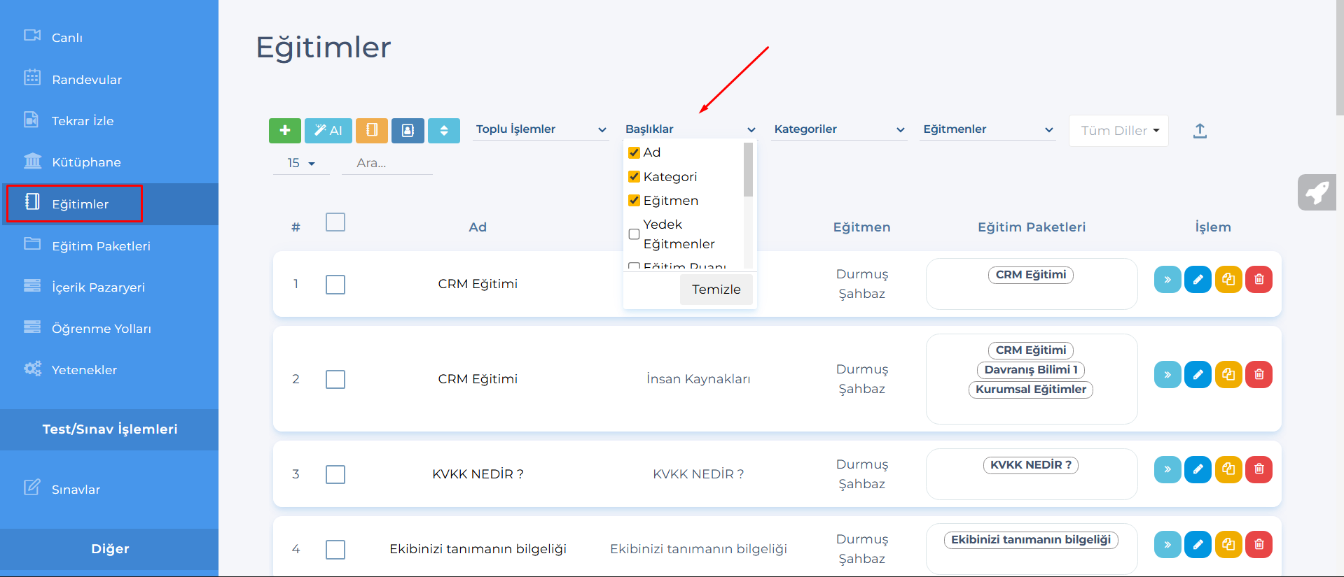 6- Admin – Eğitimler sayfasına, Başlıklar filtresi eklendi.