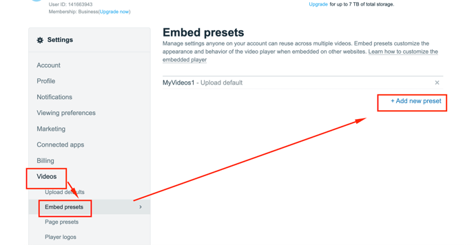 - Açılan sayfada Videos menüsü altında Embed presets > Add new preset butonunu tıklayarak yeni preset id'mizi üretelim.