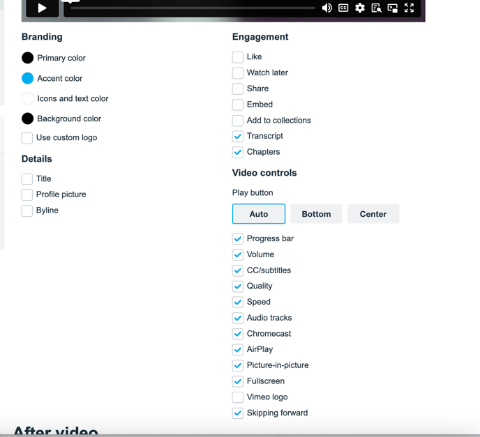 Açılan sayfada vimeo ayarlarını yapabiliriz. Tema renki ,hangi butonlar görüneceği ile ilgili ayarlar. Görseldeki gibi yapılabilir ayarlamalar.