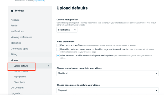 Vimeo hesabınızda ayarlar menüsine girin. Preset menüsünün bir üsttündeki Upload defaults ayarlarından video ayarlarını yapabilirsiniz.