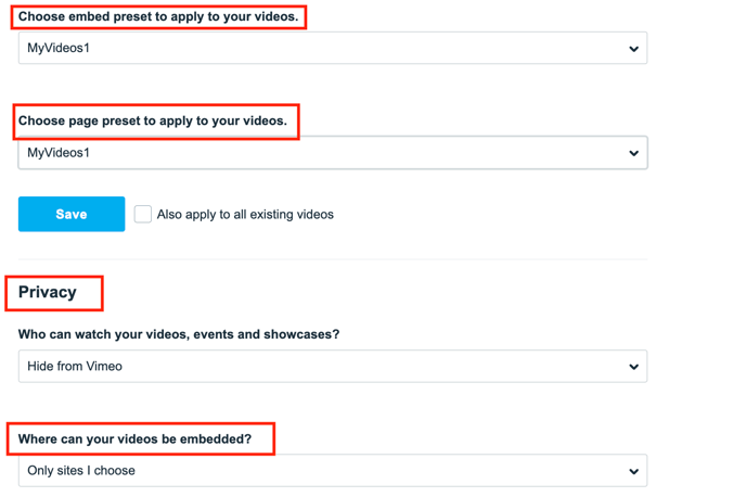 Privacy de hide from vimeo seçeneğini işaretleyerek videolarınızın vimeoda başkaları tarafından erişilmesini engelleyebilirsiniz.