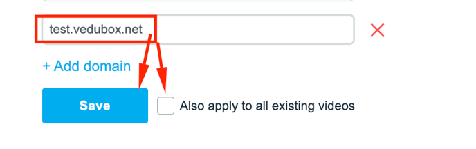 Add domain alanını seçerek hangi domaini kullanıyorsanız örneğin sistem adınız test.vedubox.net ise bunu yazıp save butonuna tıklayın. Eğer hali hazırda vimeoda videolarınız var ise Also apply to all existing videos yani var olan videolardada bu ayarı yaparak kayıt edebilirsiniz.