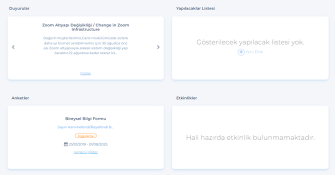 Tüm Duyurular: Sistemde yayınlanan güncel duyurular kullanıcıların ana sayfasında görüntülenir.